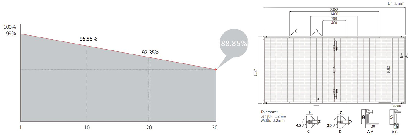 STC: AM1.5 1000W/m² 25°C NOCT: AM1.5 800W/m² 20°C 1m/s Test uncertainty for Pmax: ±3%